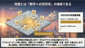 土地の値段を決める要素は、日当たりや広さだけではありません。経済学の視点で見れば、土地の価値の大部分は、その場所が持つアクセシビリティ(到達可能性)によって決まっています。今回は、なぜ目的地に手が届きやすい場所の価値が高いのか、その仕組みを解き明かします。
