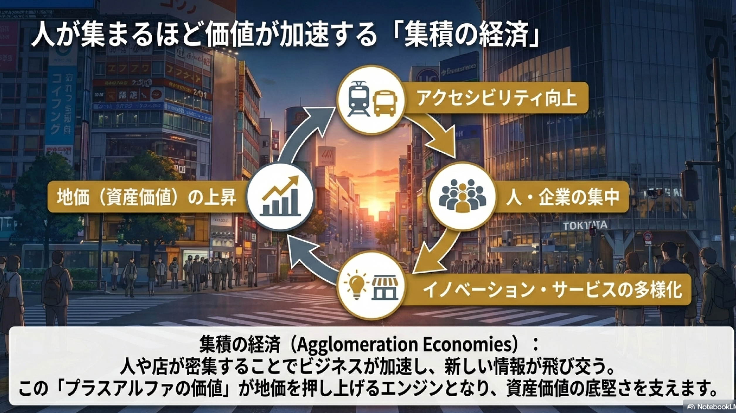 人や店が密集することで、さらに便利なサービスが生まれ、新しい情報が飛び交い、ビジネスが加速します。この集まることで生まれるプラスアルファの価値が、そのエリアの魅力をさらに高め、地価を押し上げるエンジンとなります。このように、インフラ投資によってアクセシビリティが向上すると、それが呼び水となってさらなる経済活動が生まれ、土地の価値が一段と高まっていくという好循環が生まれます。