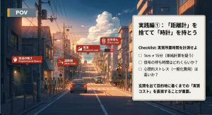 • 評価: 同じ1kmでも、徒歩(4km/h)と自転車(15km/h)では、支払うべき「時間」が劇的に異なります。