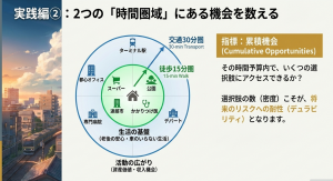 次に考えるべきは、移動に費やす15分や30分という時間予算に対して、どれだけの報酬が得られるかです。これを累積機会(一定時間内に到達できる施設やサービスの総数)と呼びます。