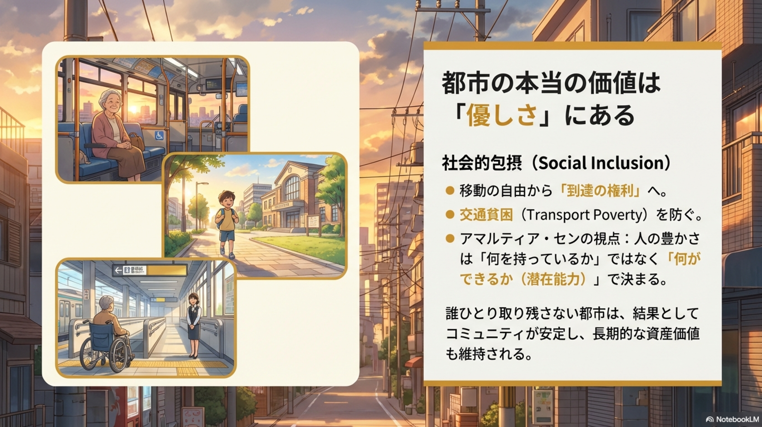 経済学者のアマルティア・センは、人の豊かさを何を持っているかではなく何ができるか(潜在能力)で測るべきだと説きました。アクセシビリティが高い街とは、まさに住民のできることを最大化してくれる街です。