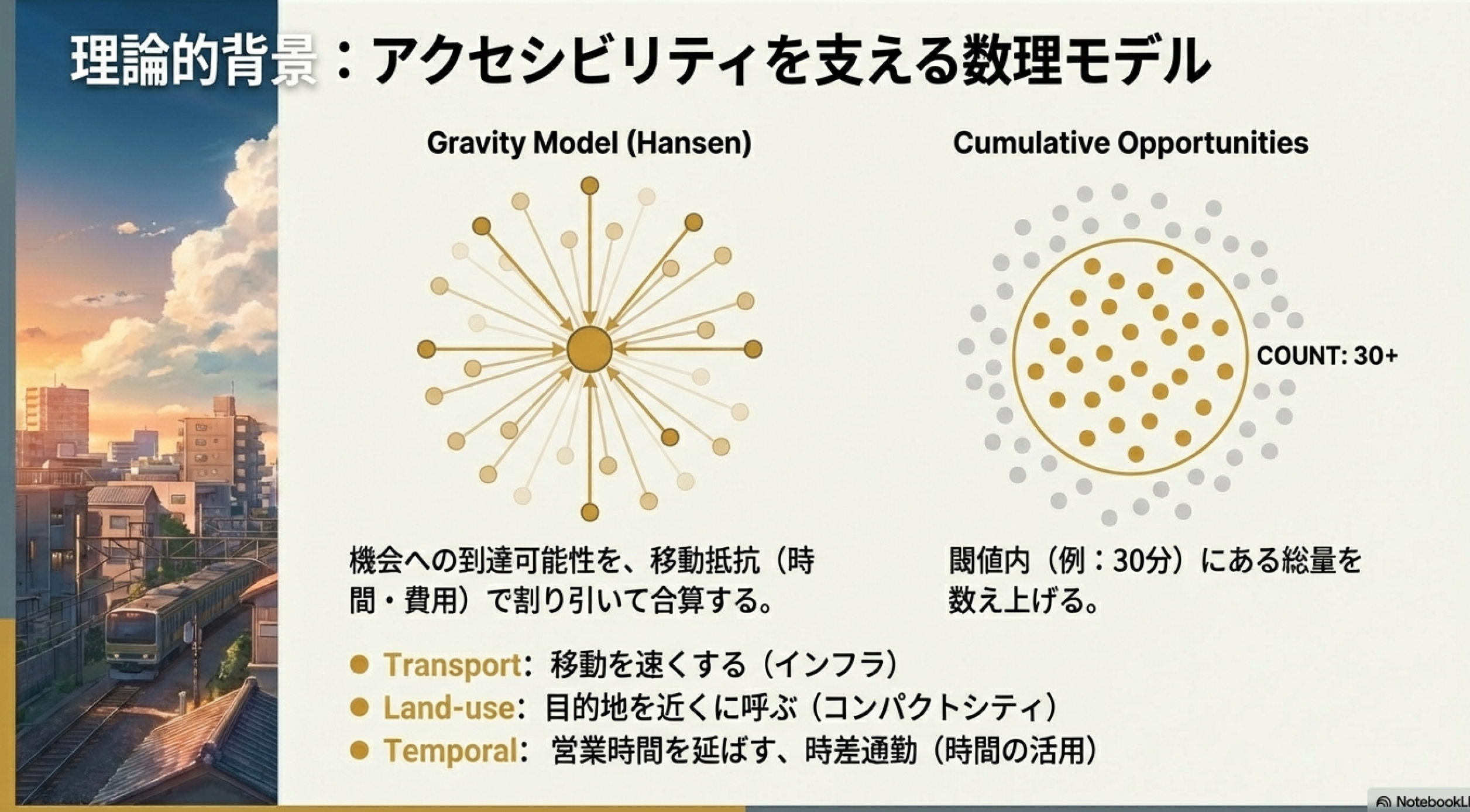 本理論は、従来の交通計画が重視してきた移動の速さ(モビリティ)ではなく、目的地への到達のしやすさ(アクセシビリティ)を評価の主眼に置くものです。インフラ・ファイナンスやLVCの議論においても、土地価値を規定する最重要変数として位置づけられます。