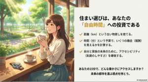 駅から1kmという距離の呪縛を解き、自分の人生の貴重な時間という予算で、どれだけの豊かな選択肢を掴み取れるか。この新しい物差しを持つことが、変化の激しい時代において価値を失わない住まいを見極めるための第一歩となります。