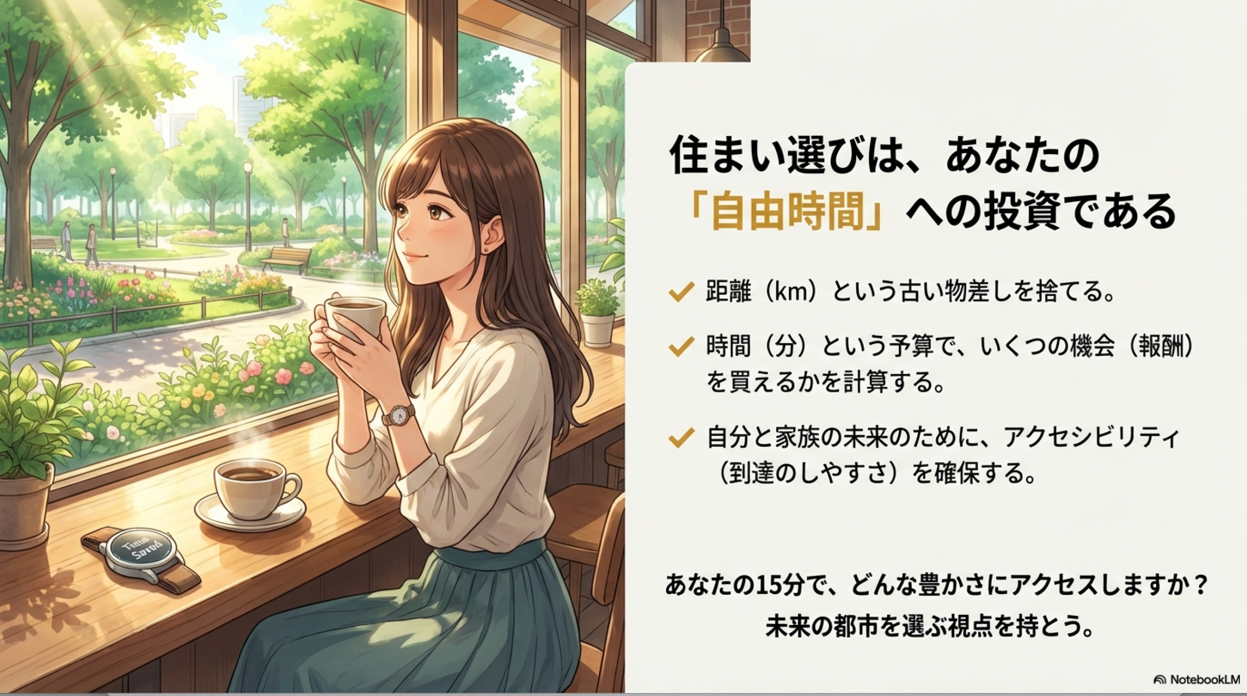 住まいを選ぶとき、あるいは街の未来を考えるとき、物理的な距離(km)という古い物差しを一度置いてみてください。そして、自分や家族、そして街に住む全ての人が、限られた時間の中でどれだけ豊かな人生の選択肢に触れられるか、という視点で街を眺めてみてください。そのたどり着きやすさの質こそが、これからの成熟社会における、本当の意味での豊かな街の定義になるはずです。