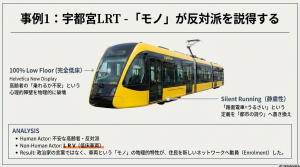 アクターネットワーク理論(ANT)を実務的なレベルに落とし込むため、地方都市におけるLRT(次世代型路面電車)の導入をケーススタディとして、どのような非人間アクターがネットワークの成否を分けるのかを分析します。