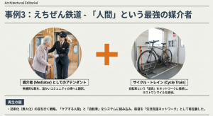 - 自転車(サイクルトレイン): 電車+自転車という異種混合のネットワークを認めることで、駅から先の移動(ラストワンマイル)の制約を物理的に解消しました。