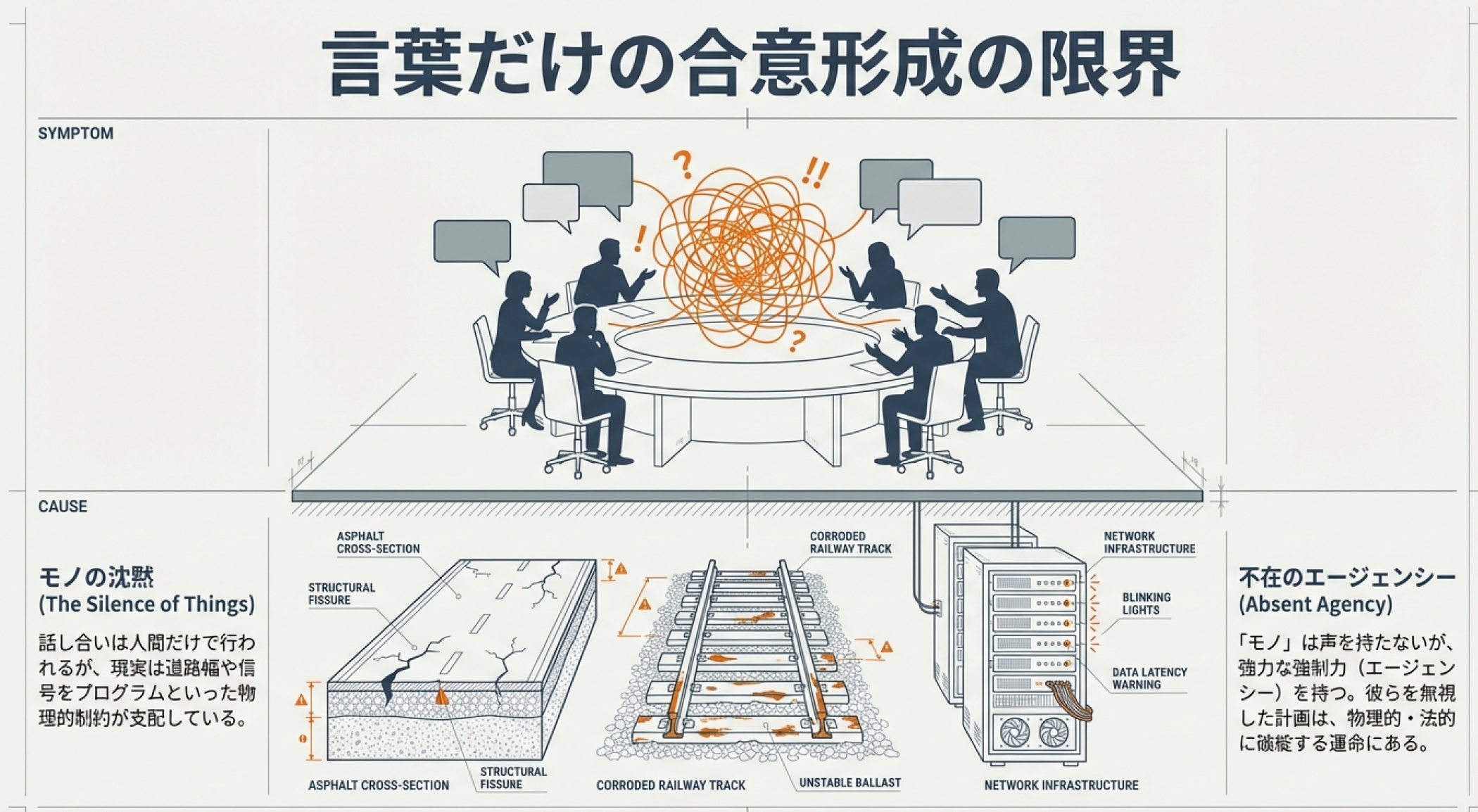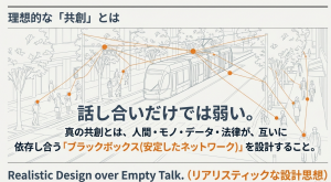 ANTの視点から見ると、理想的な都市交通の共創とは、人間(市民・専門家)が議論するだけでなく、モノ(現場の空間、データ、技術、法律)が発する制約や可能性を、いかにフェアにテーブルの上に並べられるかにかかっています。