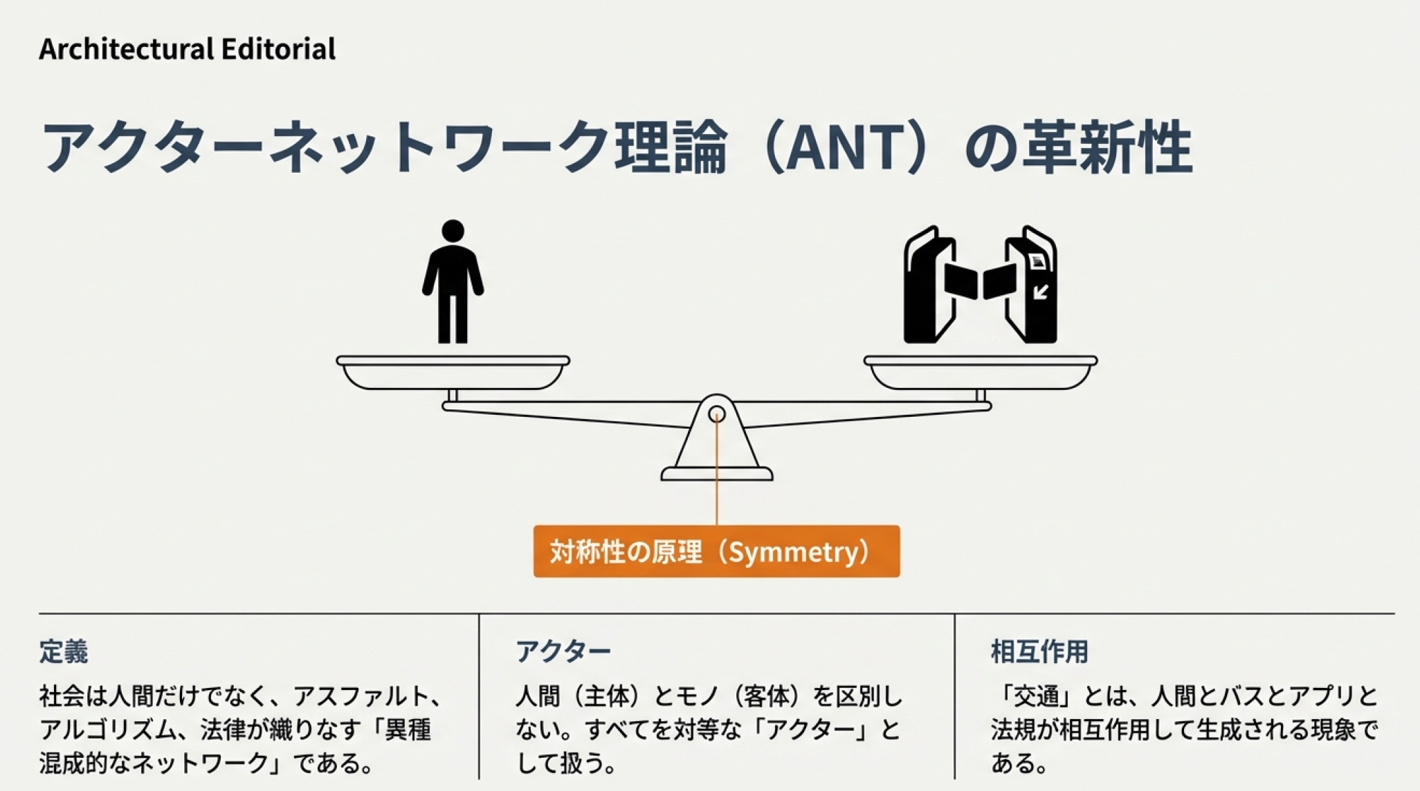 ANTは人間だけでなく、道路、信号、車両、法律、アルゴリズムといった『モノ』も、社会を形作る対等なプレイヤー(アクター)であると捉える視点を提供してくれます。