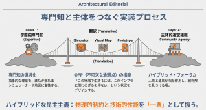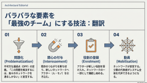 物理的制約テクノロジーといった非人間アクターの声を、いかに適切に可視化し、トランスレーション(翻訳)のプロセスに乗せるか、という設計思想になります。