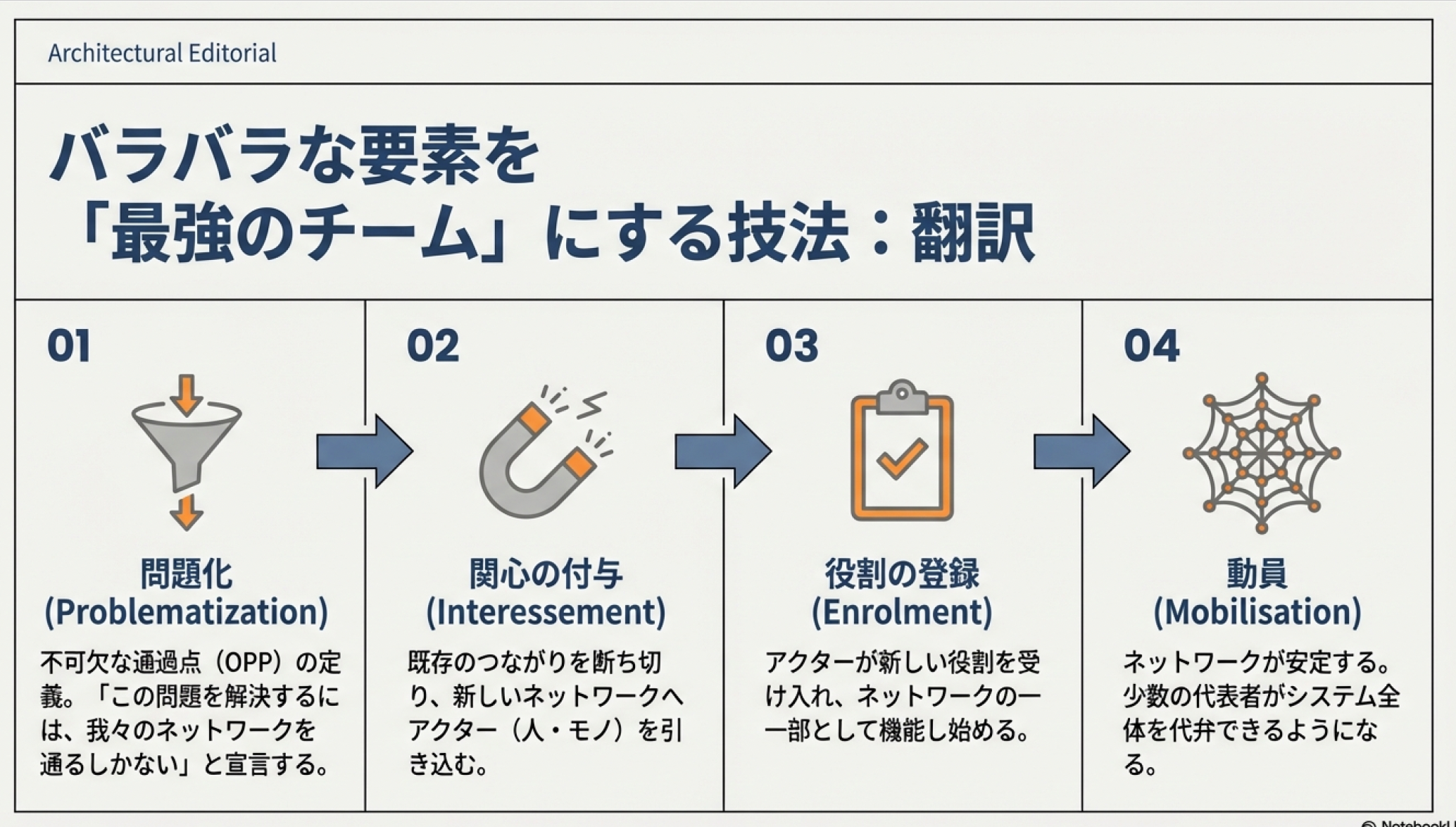 - 問題化 (Problematization): 特定のリーダー(人間や組織)がこの問題を解決するには、このネットワークが必要だと定義し、自分たちを不可欠な通過点(OPP: Obligatory Passage Point)に設定する。