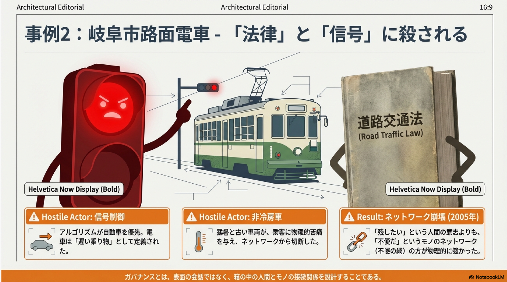 - 道路交通法: 軌道敷内への自動車の進入を許可していた法的運用が、路面電車の定時性を破壊。信号システム(非人間)が電車よりも自動車(非人間)を優先し続けたため、ネットワークが遅い・不便という負のエージェンシーを発揮しました。
