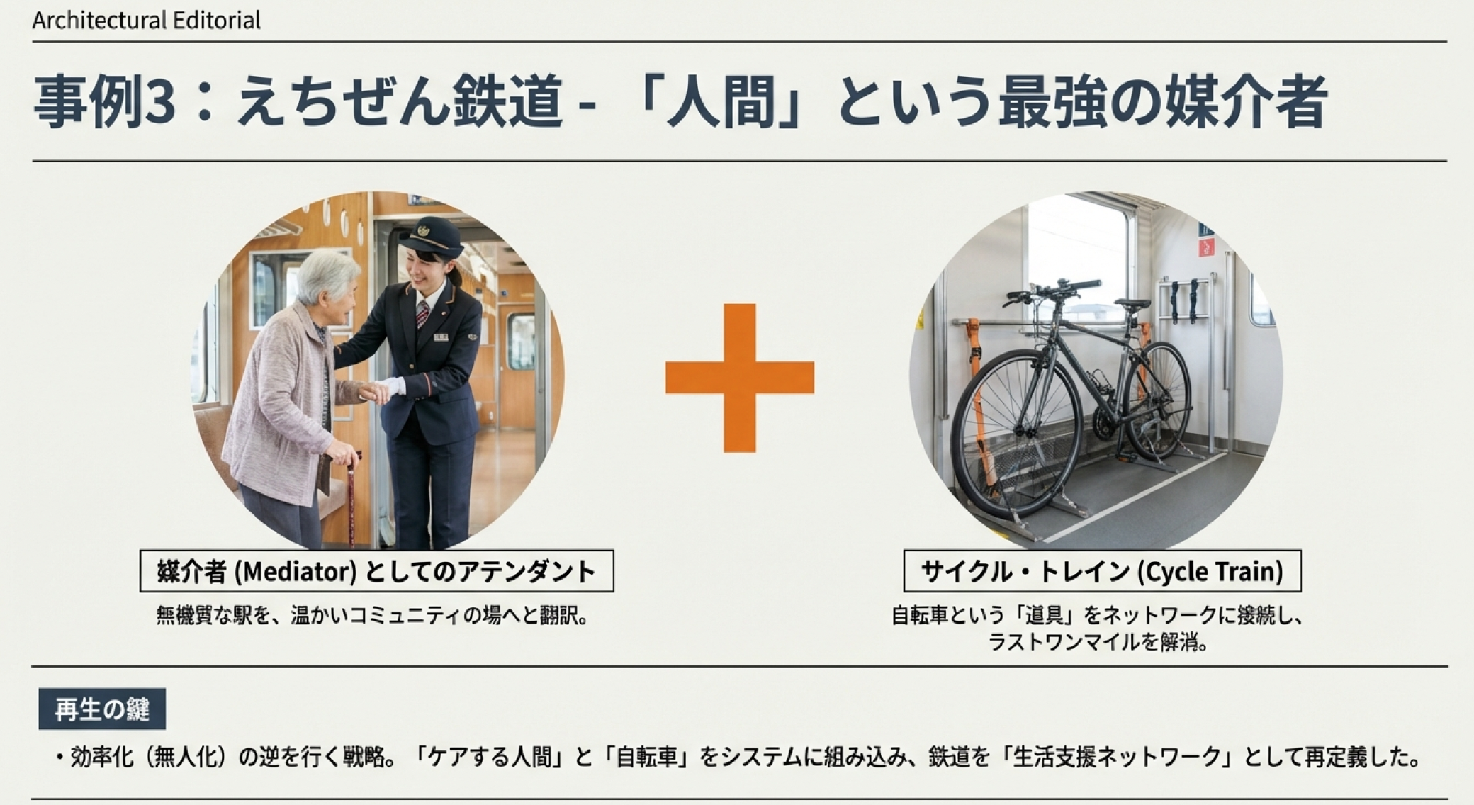 - 無人駅と切符: 無人駅という冷たい空間に、アテンダントという人間アクターを投入。彼女たちが切符の発行や乗り換え案内という機能を担うことで、不便なローカル線というネットワークを温かいコミュニティへと翻訳し直しました。