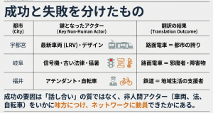 アクターネットワーク理論(ANT)の視点を用いると、都市交通の成功例や失敗例は人間の合意の問題ではなく、人間とモノのネットワークがどれだけ強固に結びついたかという視点で鮮明に分析できます。