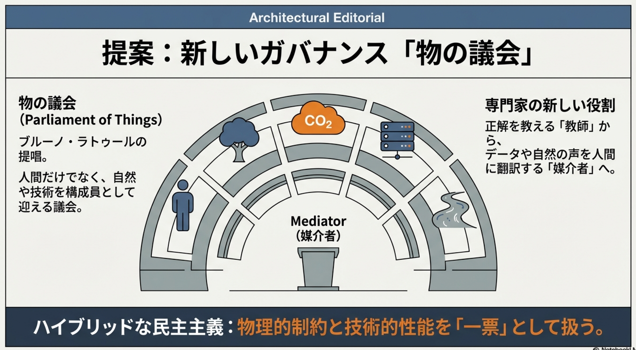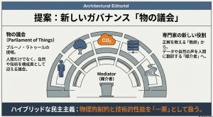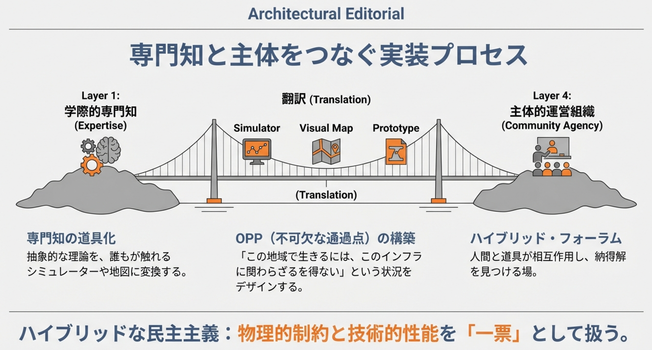 第4レイヤーのコミュニティデザインにおいて、人間だけの会議ではなく、専門家、住民、そしてデータやインフラ(非人間)が対等に並ぶハイブリッドなフォーラム(場)を設けます。