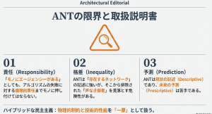 - 具体例: 交通計画において、スマホアプリ(非人間アクター)をネットワークの核に据えたとき、ANTは効率的なネットワークと評価しますが、スマホを持てない低所得者や高齢者がネットワークから排除されている事実を過小評価してしまう可能性があります。