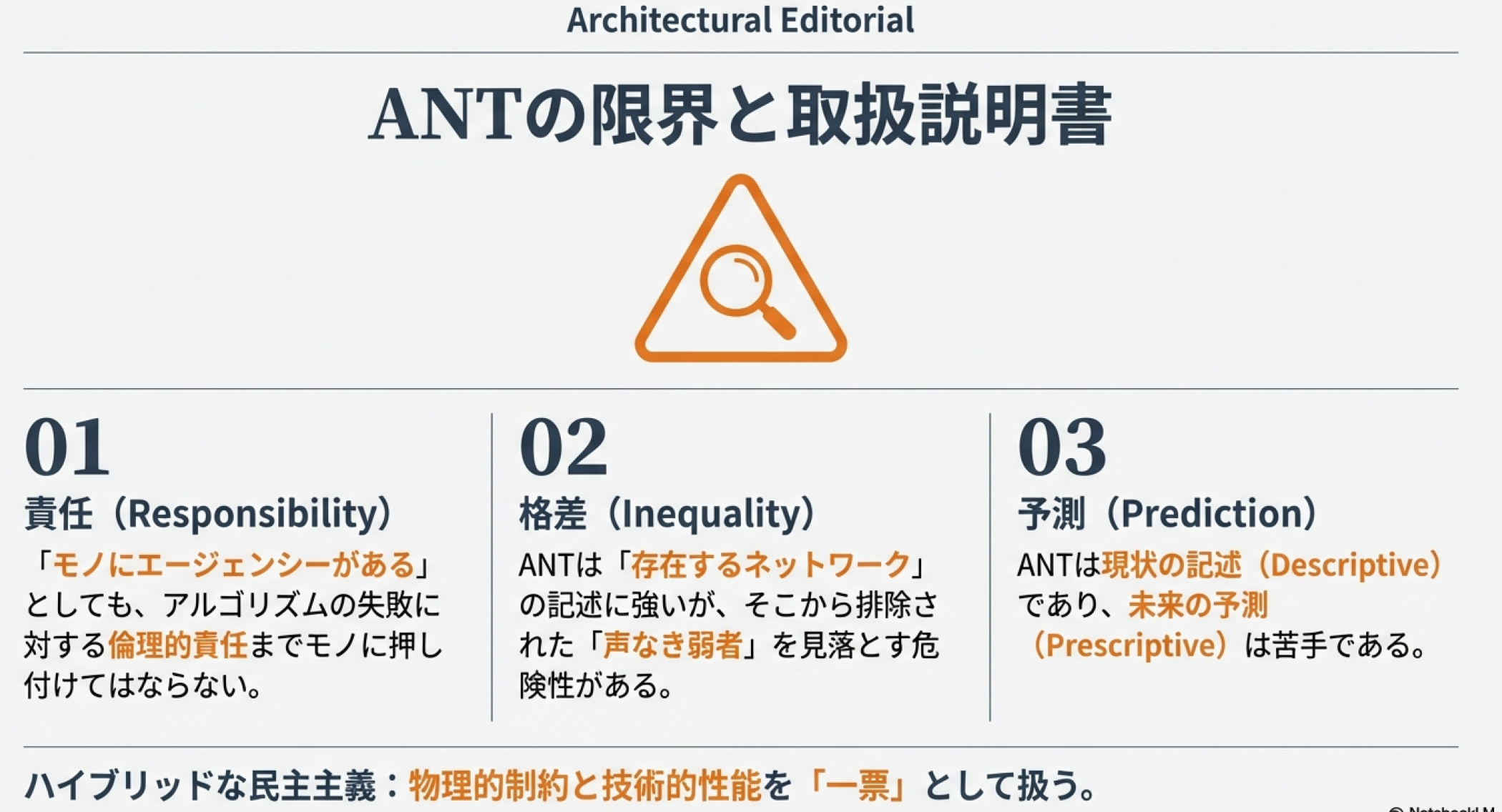 | 責任の拡散 | 政治的決定の分離 | ネットワークの分析(記述)と、最終的な意思決定(責任)を切り分ける。 |