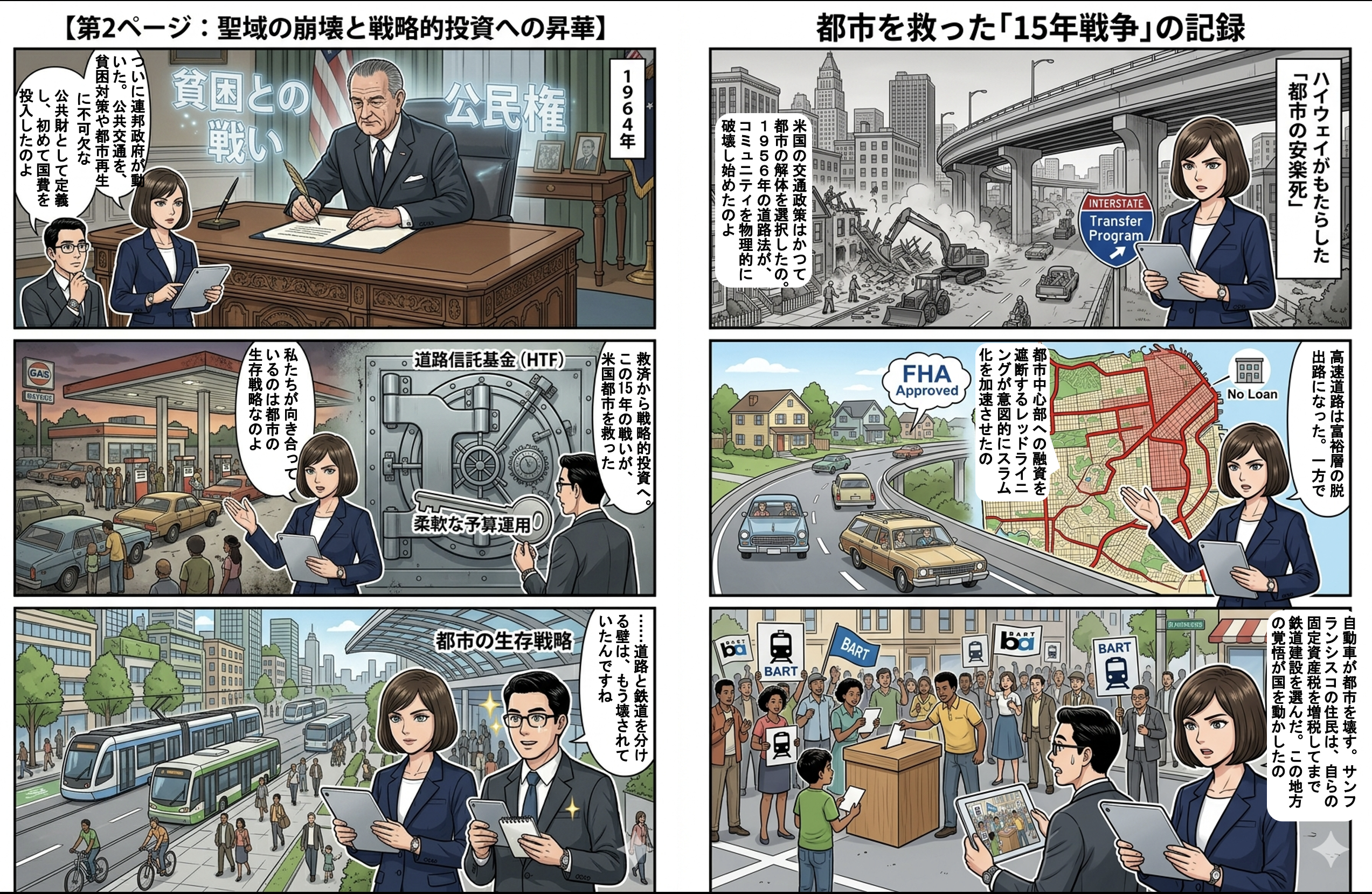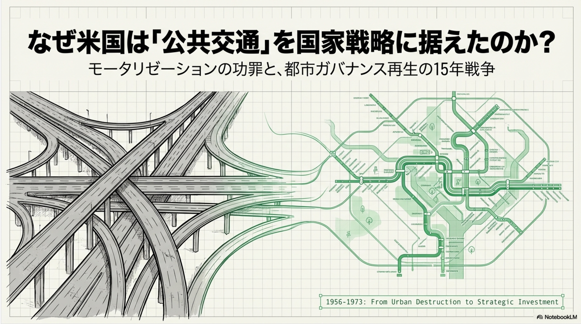 1950年代、米国を襲った高速道路による「都市の破壊」。物理的断絶とホワイト・フライトに直面した都市のリーダーたちは、いかにして道路至上主義のドグマを崩したのか?1964年UMTA(都市大量輸送法)による公共交通の「公共財化」から、1973年の道路信託基金(HTF)開放に至る激動の15年を分析。救済から戦略的投資へと昇華した、現代都市ガバナンスの原点となる歴史的転換点を解き明かします。