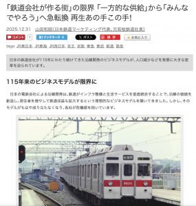 12月31日、執筆記事が掲載されました。鉄道技術展、沿線まちづくりシンポジウムなどから構成しました。記事の場合は視点を絞る必要があるため、あの手この手を紹介しづいのですが、鉄道会社のまちづくりが多様化している片鱗を感じていただけましたら幸いです。