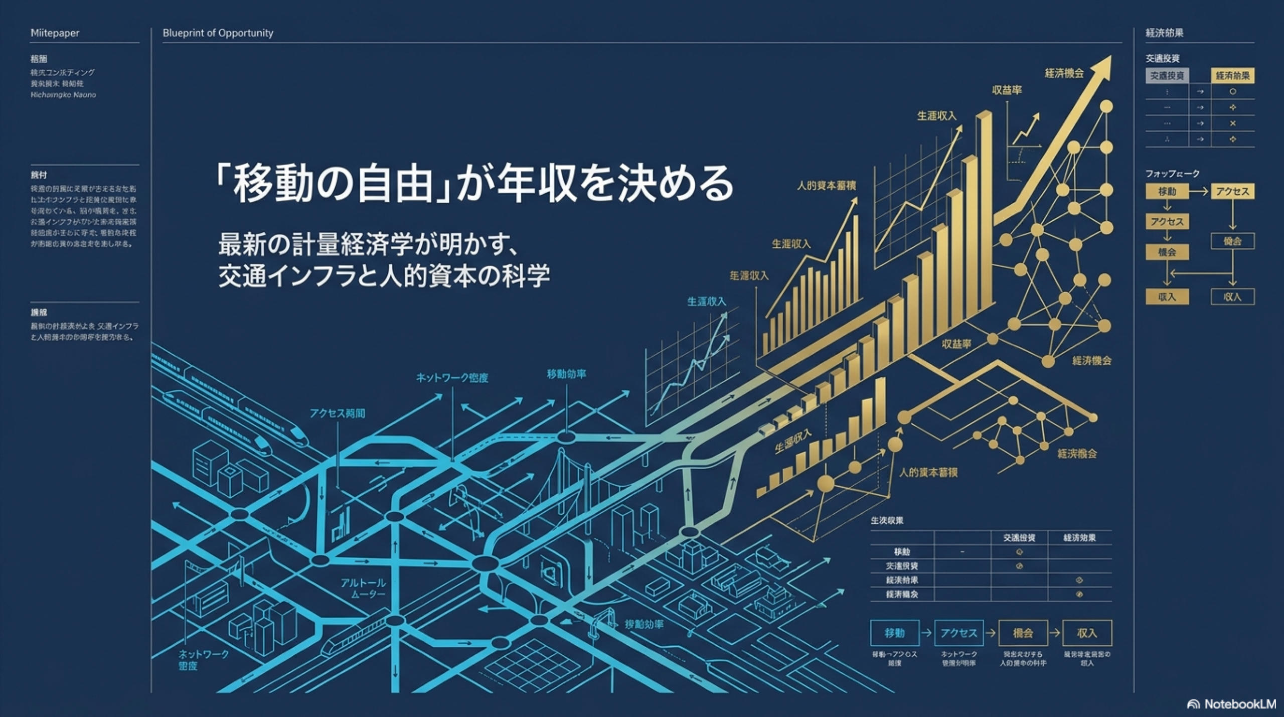 総じて、交通インフラは単なる移動の効率化を超え、人的資本の形成・マッチング・外部性発揮という多層的なメカニズムを通じて、個人の経済的運命および社会の生産性構造を再規定する基盤的役割を果たしている。