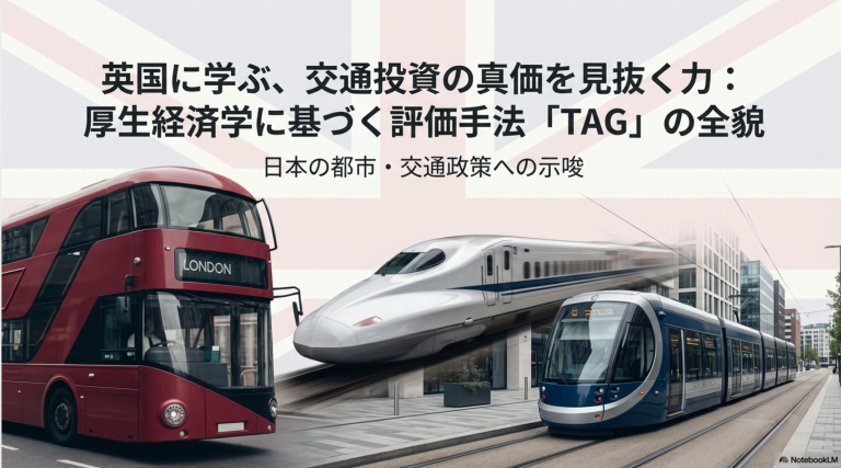 世界で最も精緻な英国の評価マニュアルTAG(Transport Analysis Guidance)は、健康増進や集積による生産性向上、さらには「知の交流」がもたらす経済効果までを可視化します。人口減少下の日本で、インフ … 続きを読む 鉄道も道路も集積の価値を同じ土俵で評価する英国TAG