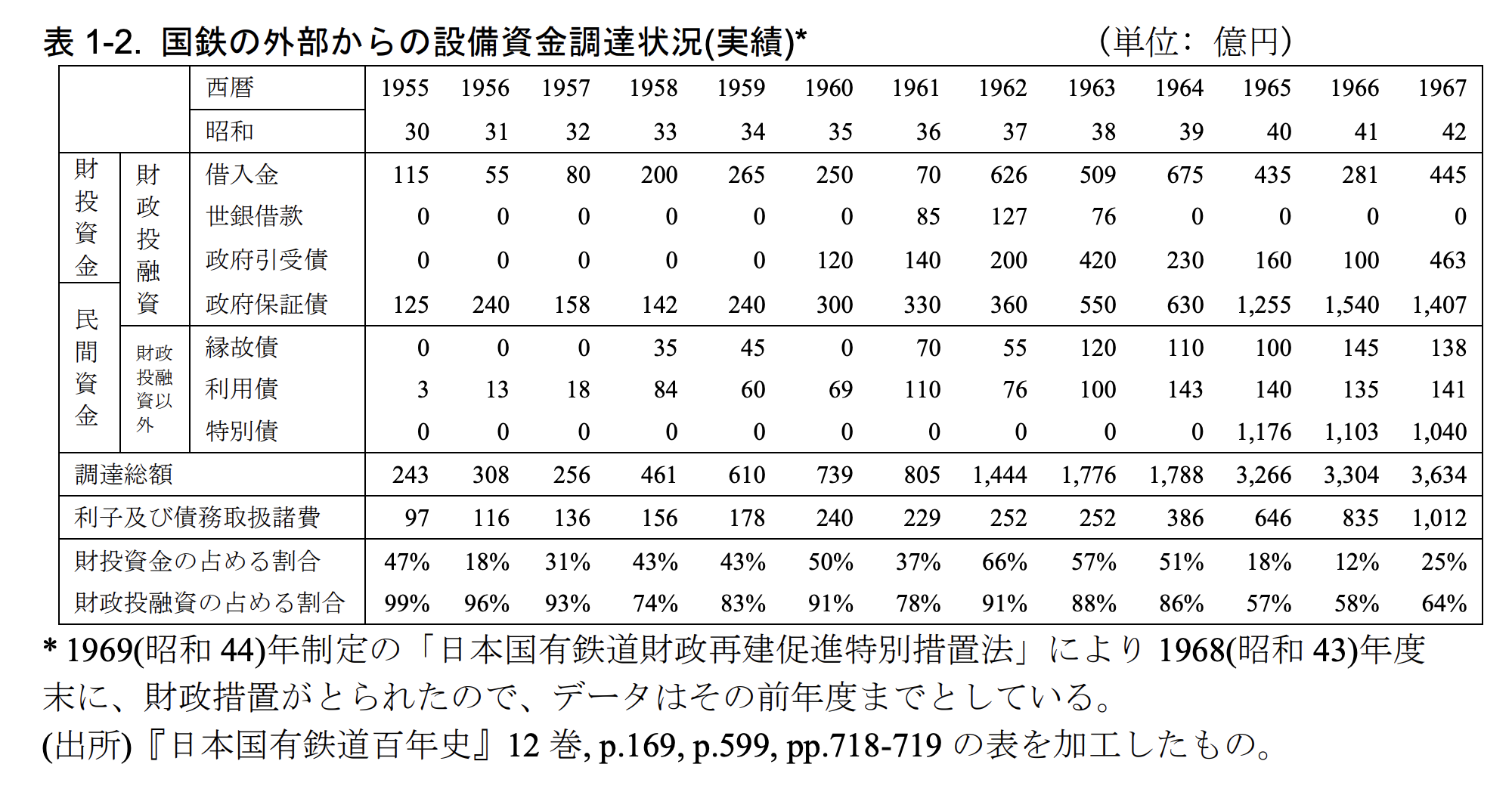 - (2) 旅客輸送増強(通勤五方面作戦、各新幹線建設)の総投資額と、その資金調達における借入金の割合を特定する。