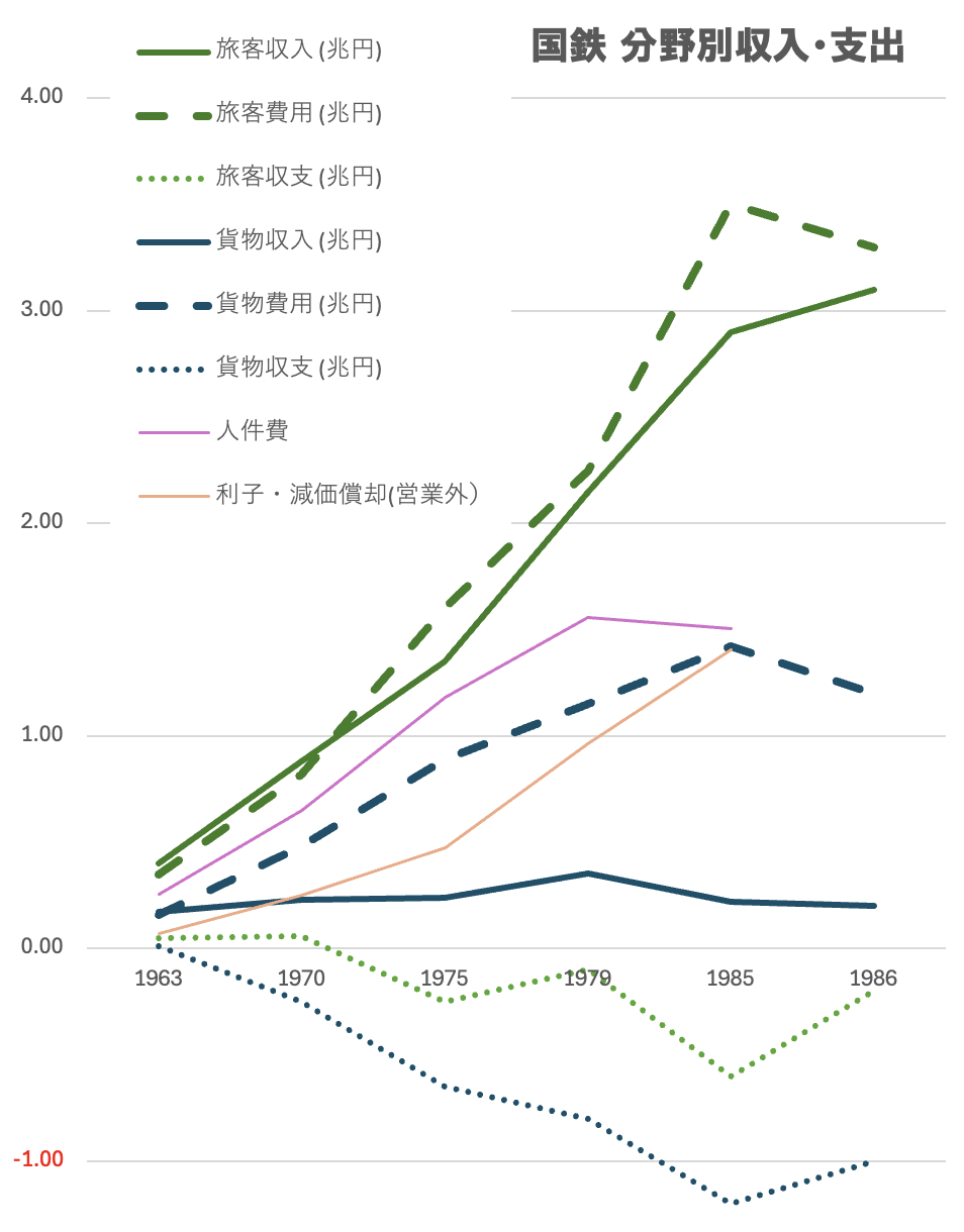 国鉄が赤字に転落する直前の1963年度から、民営化直前の1986年度までの主要部門別数値を以下の表にまとめる。