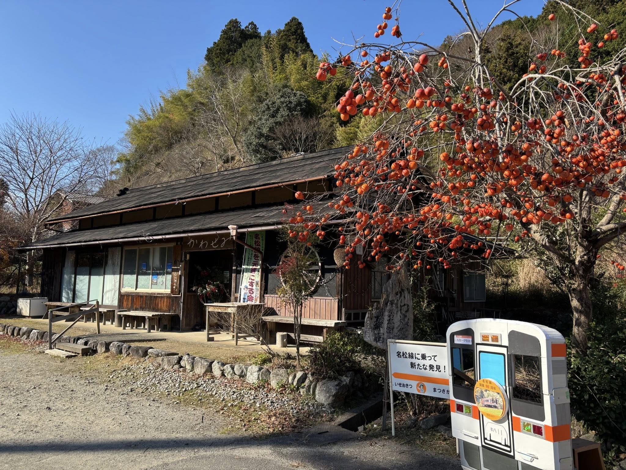 写真:かわせみ庵かわせみ庵。柿とキハ11のオレンジがマッチしています。