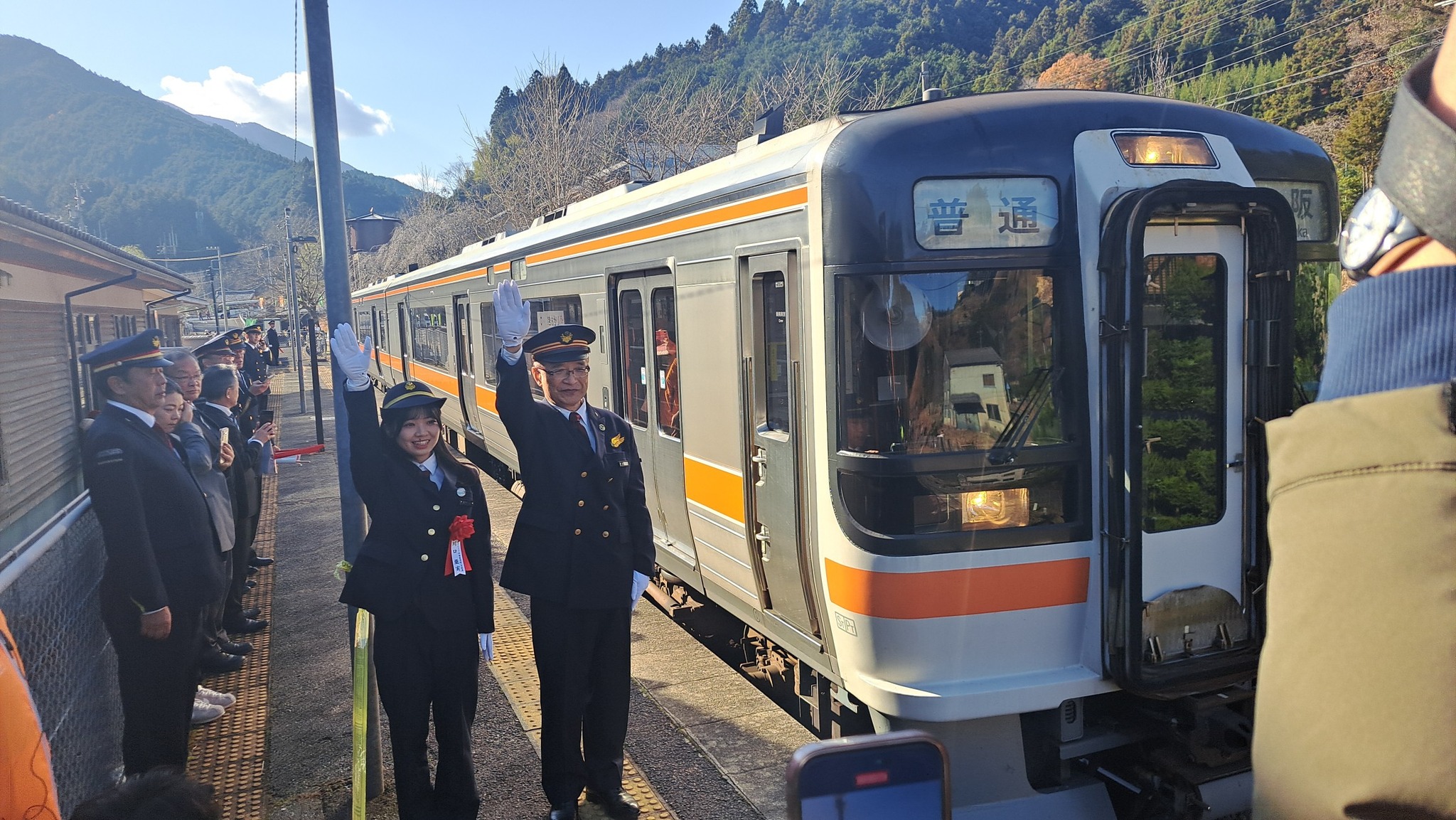 また、出発式のために津市長が伊勢奥津駅の一日駅長に、津クイーンの川口亜実(かわぐち あみ)さんが一日駅員にそれぞれ就任され、記念列車の出発合図を行います。