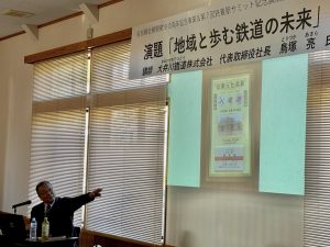当日は、大井川鐵道鳥塚社長による記念講演。機芸出版社「シーナリーガイド」に伊勢奥津駅が掲載され「全国の鉄道ファンが憧れている駅」と紹介されました。また、ローカル線が地域の発進に絶大な威力を発揮すること、会津の只見線では市民の写真活動が台湾で紹介されインバウンドが多く訪問していることなどが紹介されました。