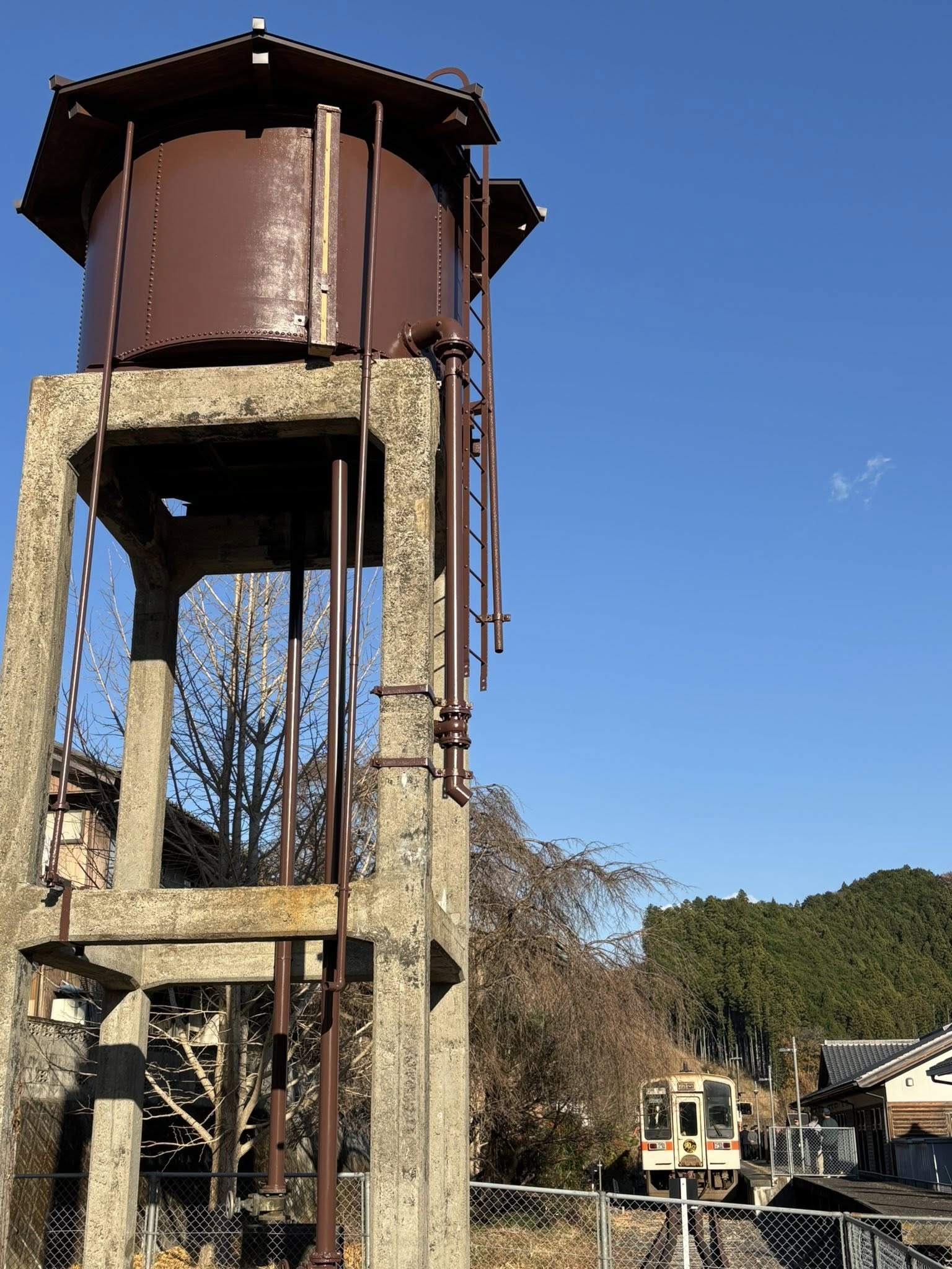 復元・改装され国の有形登録文化財に指定された伊勢奥津駅 給水塔。記念ヘッドマーク付き列車が到着。