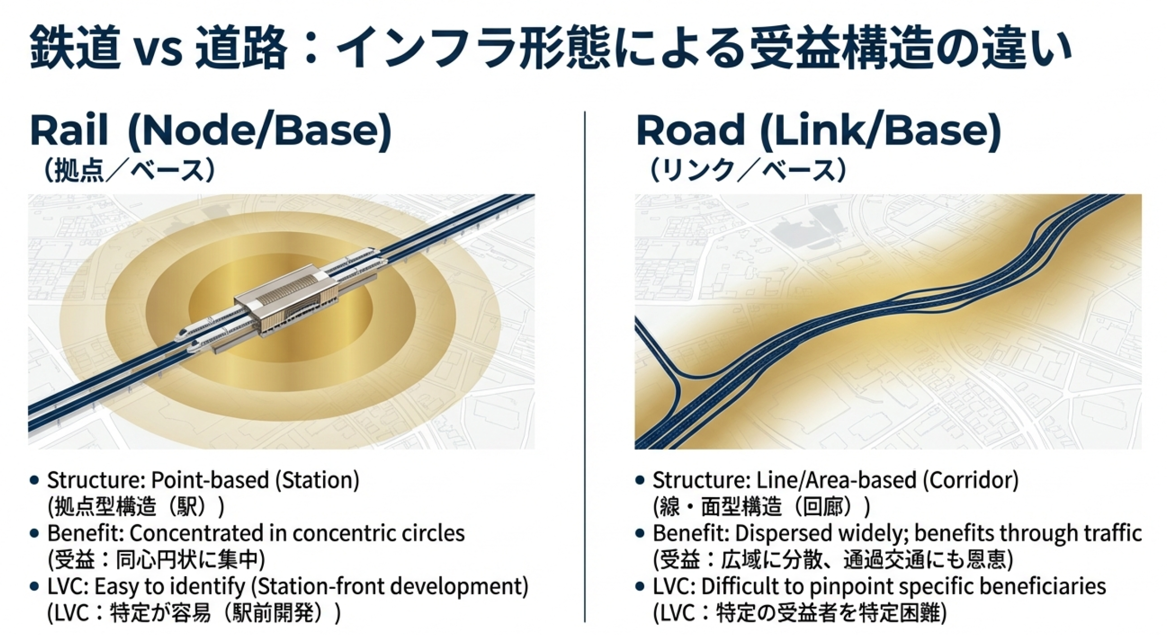 LVC(土地価値還元)を実務に適用する際、対象となるインフラが「鉄道」か「道路」かによって、地価上昇の現れ方と回収の難易度は大きく異なります。これは、それぞれの交通モードが持つネットワーク特性と、アクセス性の向上に付随する「空間的な広がり」の差に起因します。