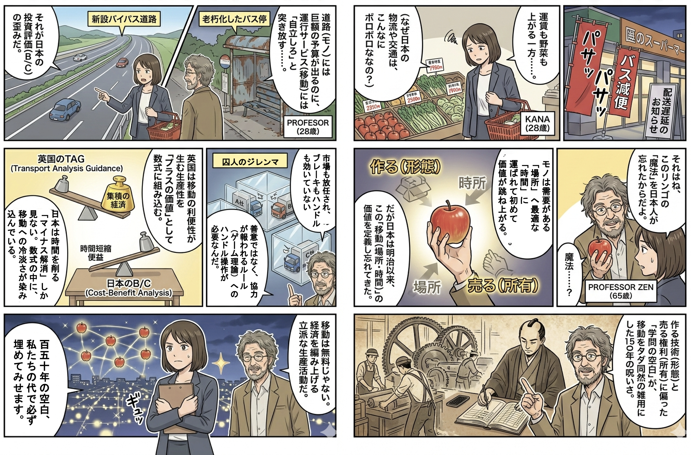 移動は決して、無料でもなければ、気合いで解決できる雑用でもありません。それは、モノや人の価値を別の場所、別の時間へとつなぎ、経済を駆動させる立派な生産活動です。この当たり前の事実を、もう一度私たちの学問と政策、そして生活の実感の中に据え直す必要があります。