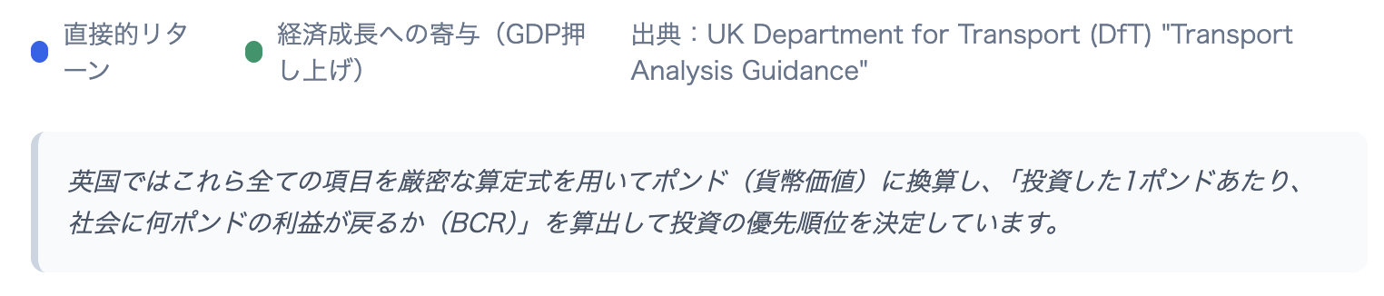 - 英国のロジック: 鉄道単体で赤字でも、その路線が地域の有効密度を支え、医療費を削減し、企業の生産性(Level 3)を上げているなら、それは『価値ある公的投資』であると、厚生経済学(TAG)で証明して存続・強化させる。