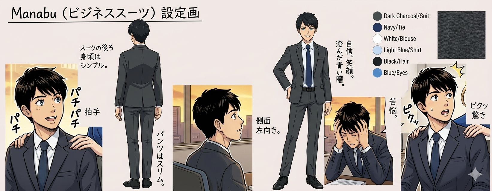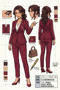- 知性的で情熱的。言葉に力がある。ワインレッドのスーツを着こなす。